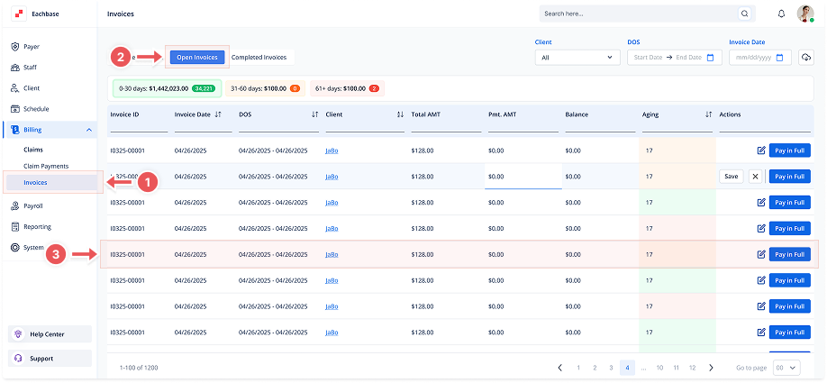 At the top of the page, click the Open Invoices tab to view the list of Open Invoices.