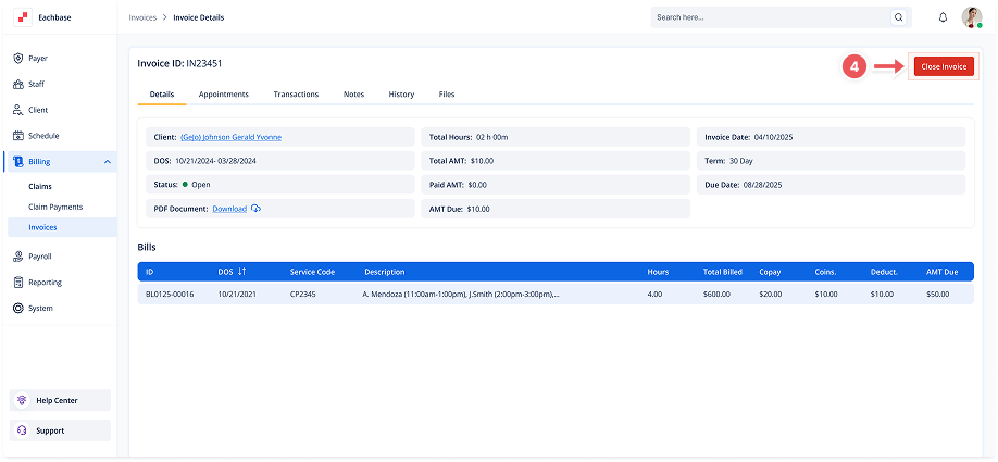 On the Details tab of the invoice, locate the Close Invoice button in the top-right corner.