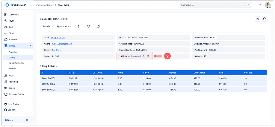 Downloading the 1500 Form for a Completed Claim 1. Navigate to Completed Claims Go to the left sidebar and click on Billing > Completed Claims. From the Completed Claims list, click a Claim ID to open the details. 2. Download the Form On the details page, find the 1500 Form section. Click Download to export the completed form.