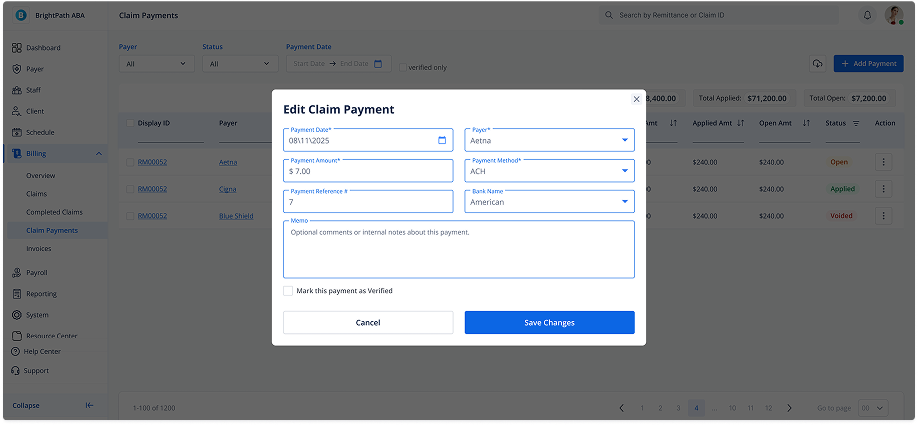 This will open the Edit Claim Payment modal with the current values filled in.