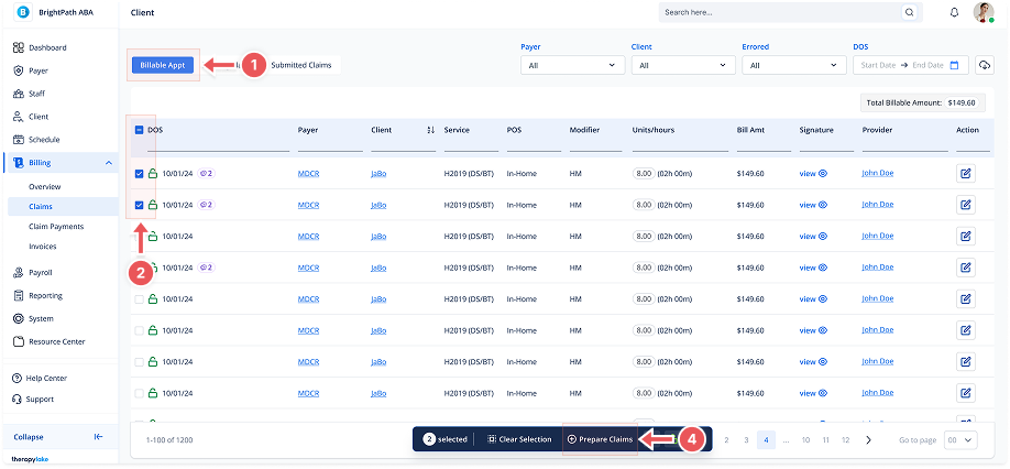 Go to the left sidebar and click on Billing > Claims > Billable Appt.