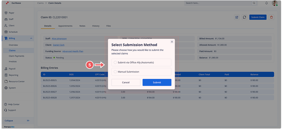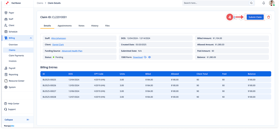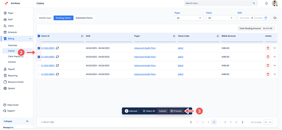 Go to the left sidebar and click on Billing > Claims > Pending Claims.