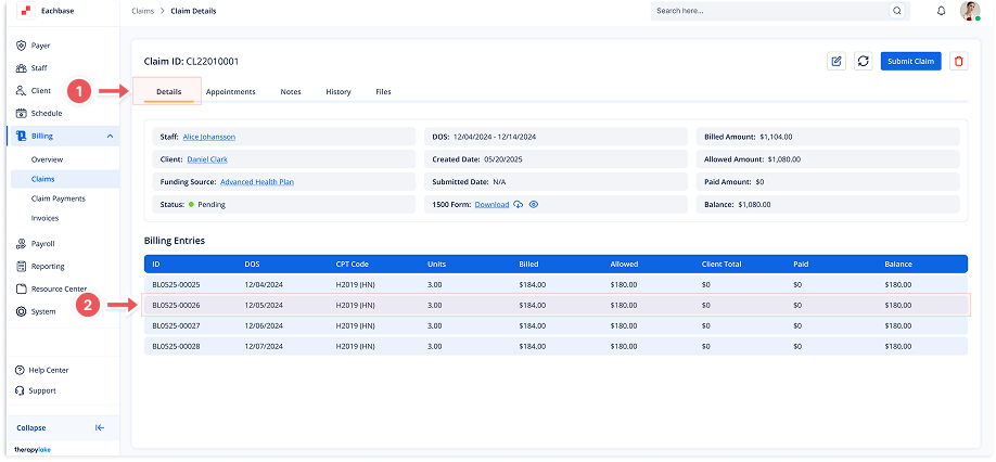 In the Claim Details view, locate the section with billing entries.