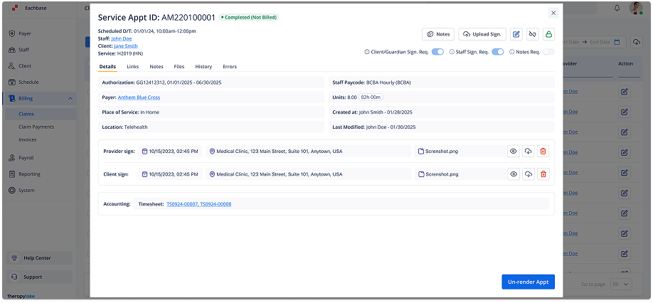The appointment details page will display relevant information about the appointment, such as Payer, Client, Service, POS, Units/hours, Bill Amt, Signature and Provider.