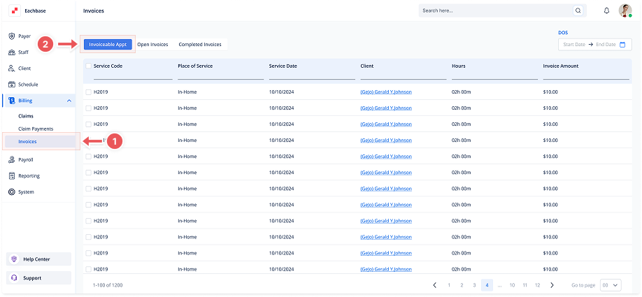 Appointments will be listed with details such as Service Code, Place of Service, Service Date, Client, Hours, and Invoice Amount.