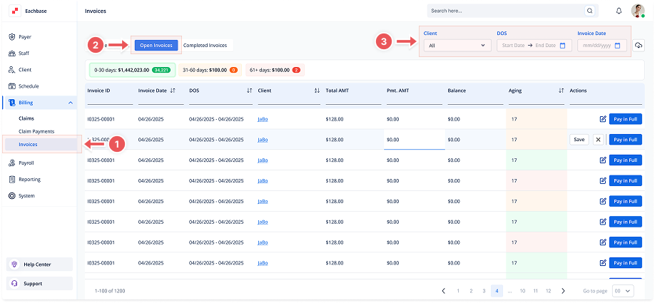 Invoices will be listed with details such as Invoice ID, Invoice Date, Client, Total Amount, Payment Amount, Balance, and Status (Open, Paid, etc.).