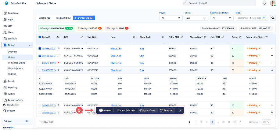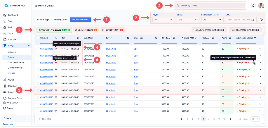 Go to the left sidebar and click on Billing > Claims > Submitted Claims.