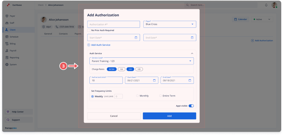 • Click the Add button at the bottom right of the modal to save the authorization and any associated authorized services.