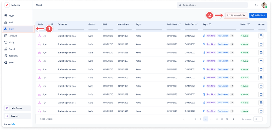 On the top right of the Client section page, find the Download CSV button.