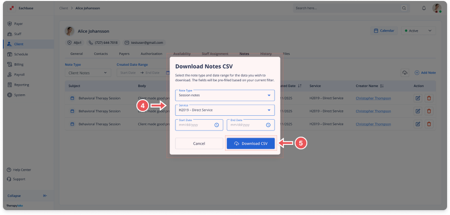 Click Download CSV to export the filtered notes into a CSV file.
