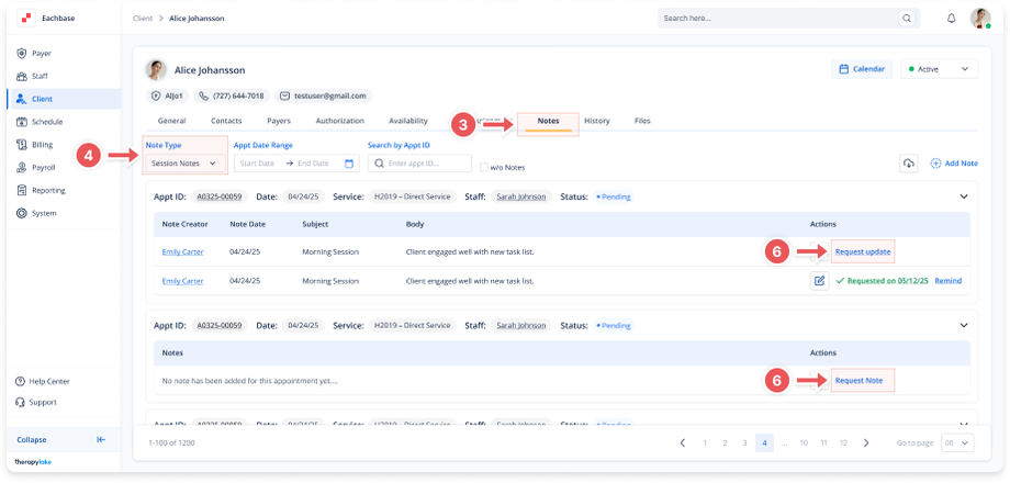 Click Request Note to ask for a new note if it's missing, or click Request Update to ask the staff to revise or complete an existing note.