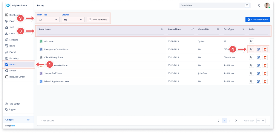 Use the icons in the Action column to edit, download, or delete a form.
