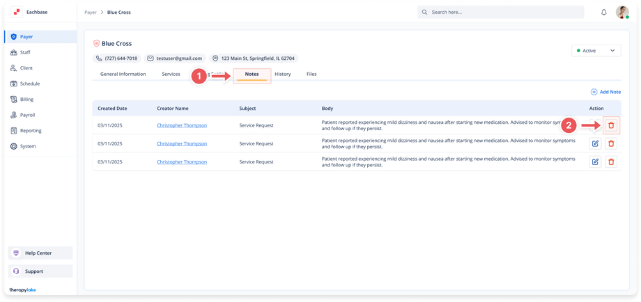 - Click Delete on the confirmation pop-up window. The note will be removed from the notes table.