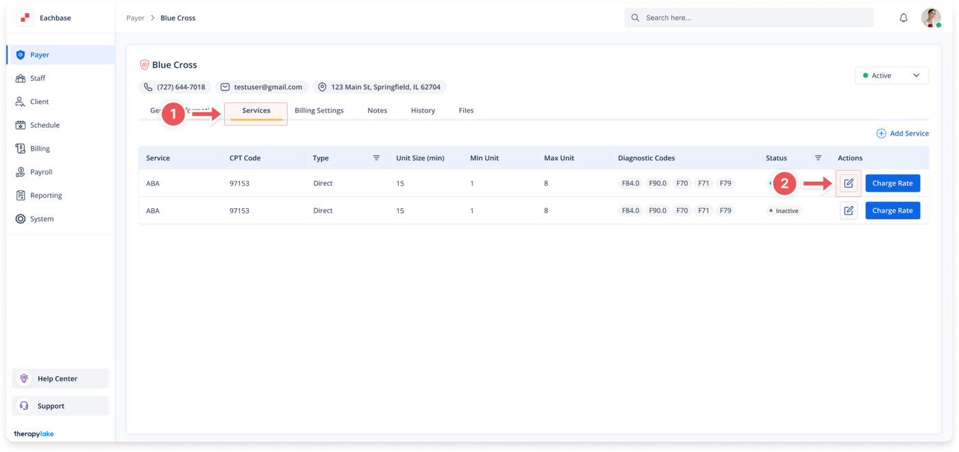 - Click on the Payer for which you want to Edit a service.