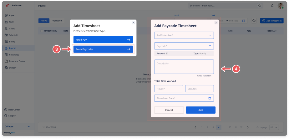 A modal titled Add Paycode Timesheet will appear. Fill in the following fields: