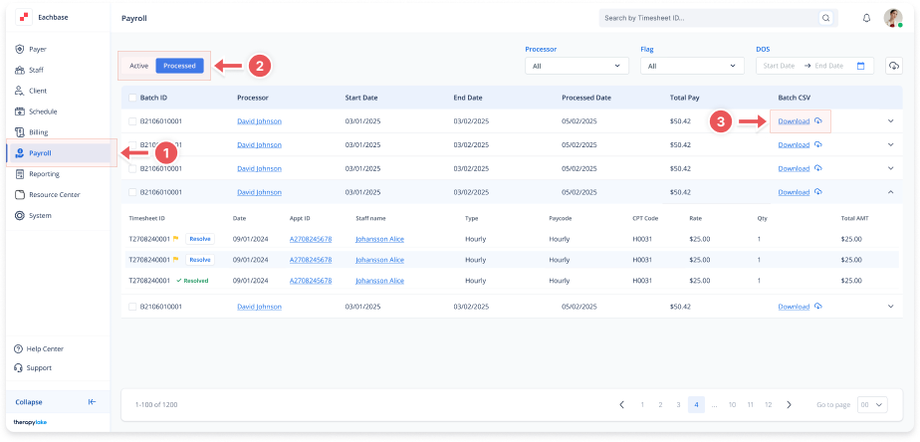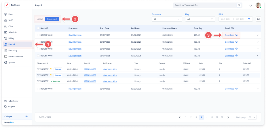 This will immediately download the processed payroll timesheets for that specific batch as a CSV file to your local device.