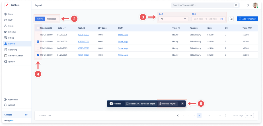 Once you have selected the timesheets, click the Process Payroll button in the action bar.