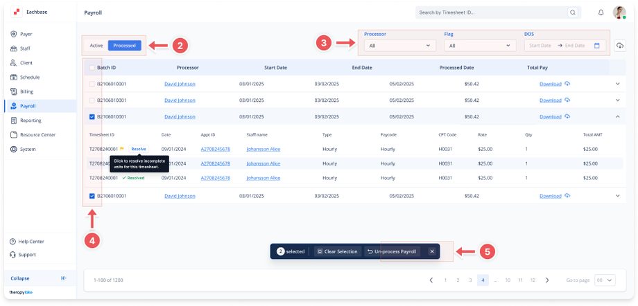 Select the Processed tab at the top left to view the list of processed payroll batches.