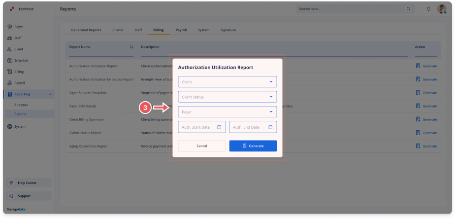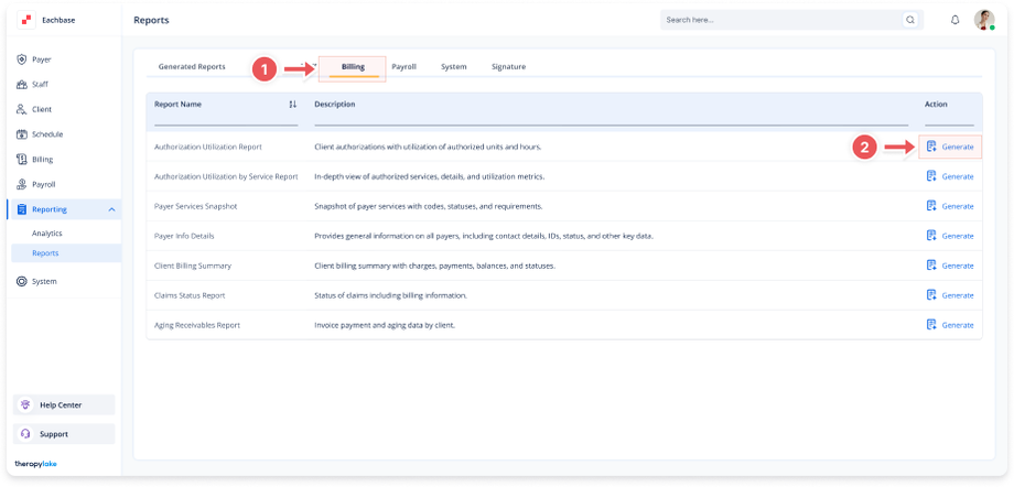 Go to the left sidebar and click on Reporting > Reports > Billing.