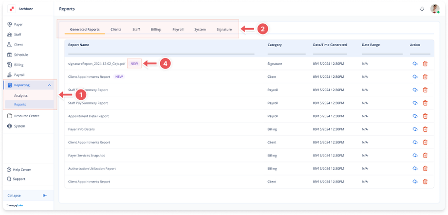 When a report is generated, a "NEW" tag will appear next to it in the reports list.