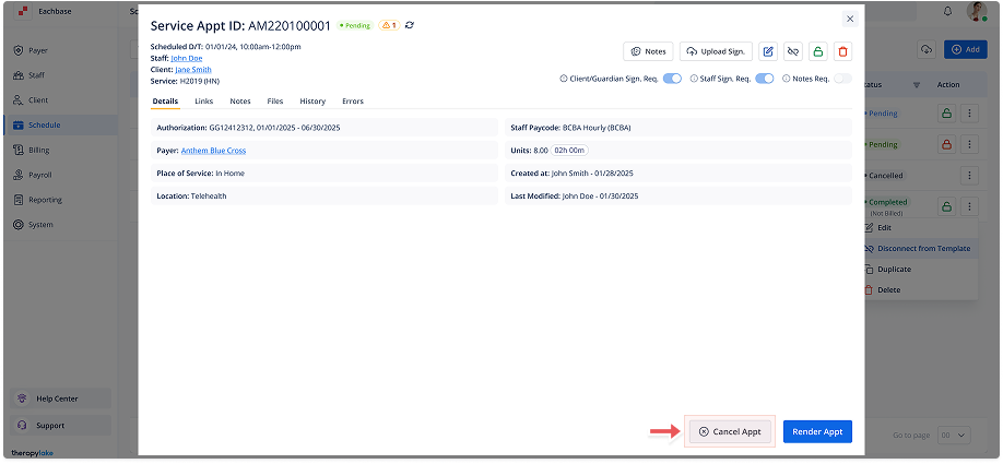 The appointment will be marked as canceled, and its status will update in the schedule.