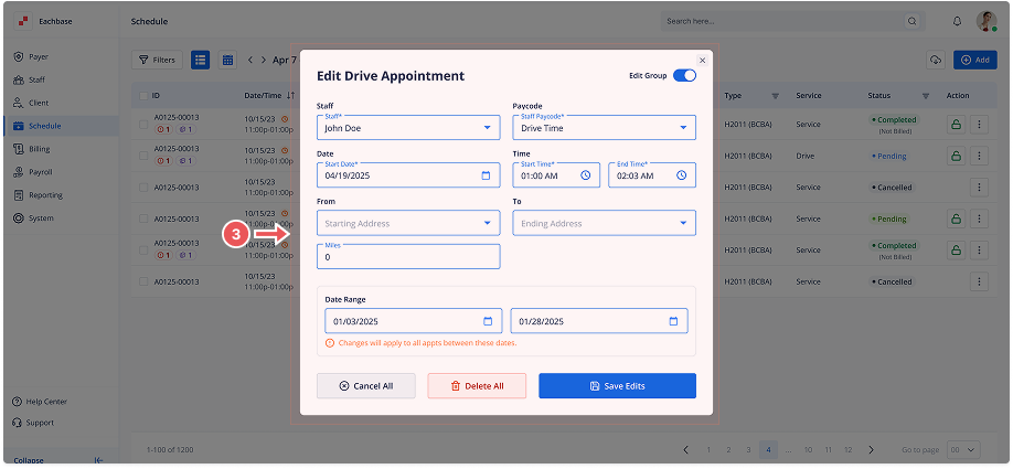 For Drive Time appointments, an additional field for Mileage will be available to edit. Make sure to update the mileage value if needed.