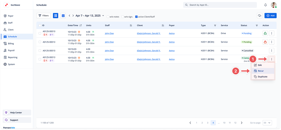 The newly created recurring appointments will now appear in the Schedule list, based on the set pattern and date range.