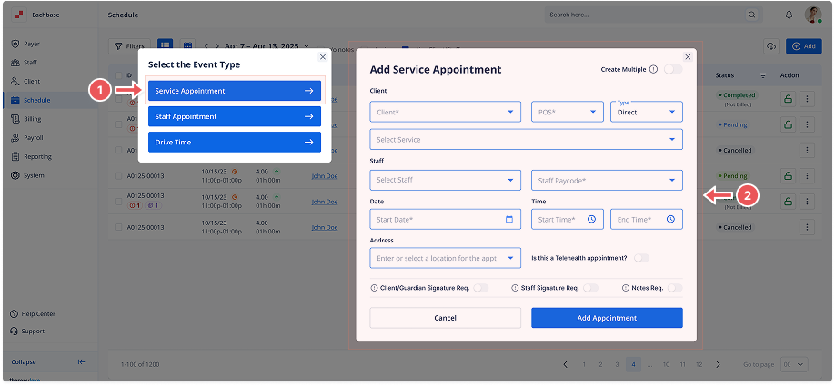 A modal labeled Select the Event Type will appear. Choose Service Appointment from the list of event types.