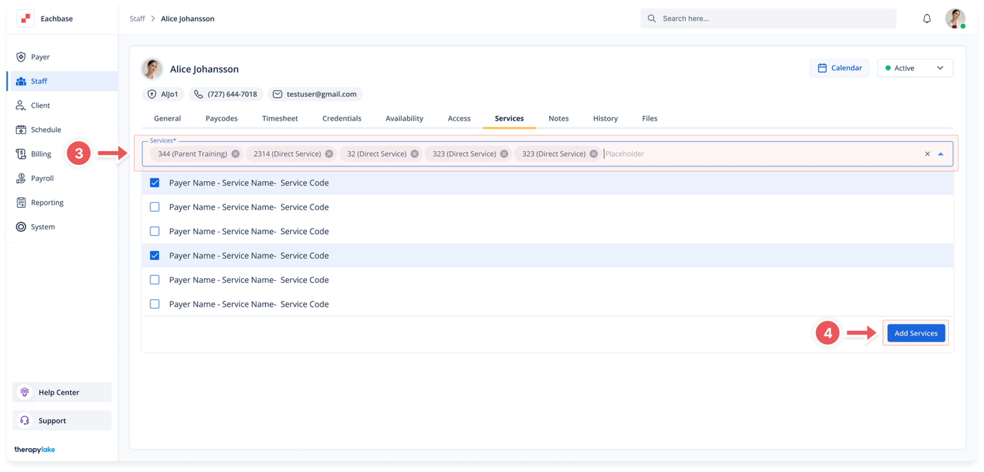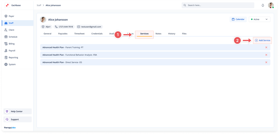 After adding the services, you will see them appear in the Services list for the selected staff member.