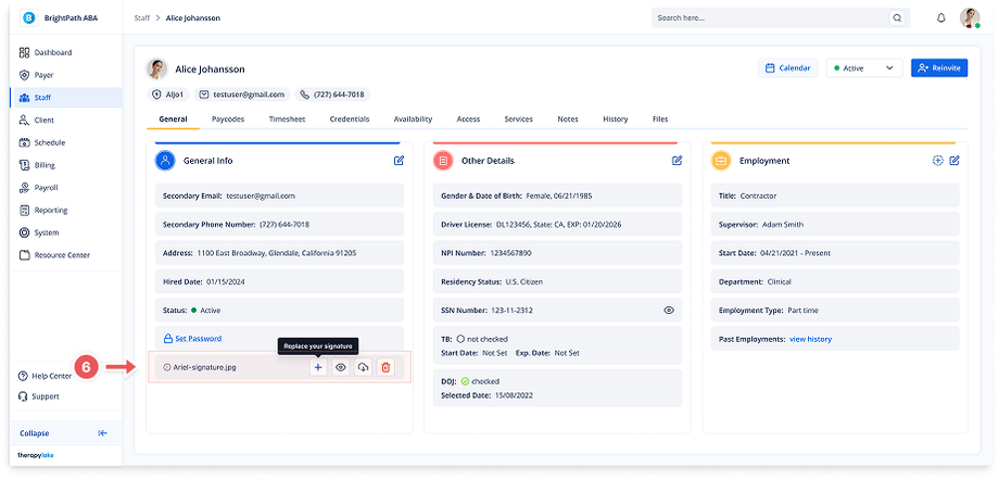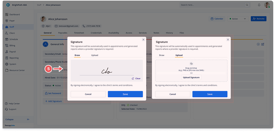 Staff members can upload or draw a digital signature that will be automatically used in appointments and generated reports when a provider signature is required.