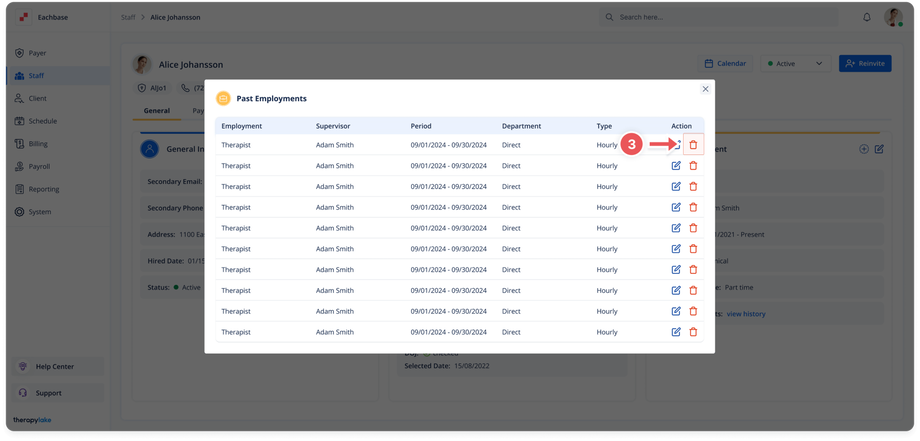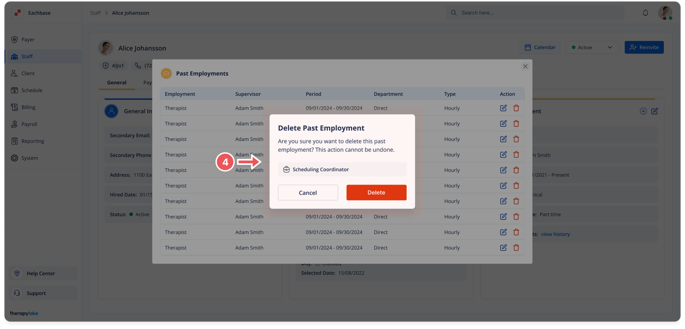 - Choose the staff member whose past employment you want to delete.