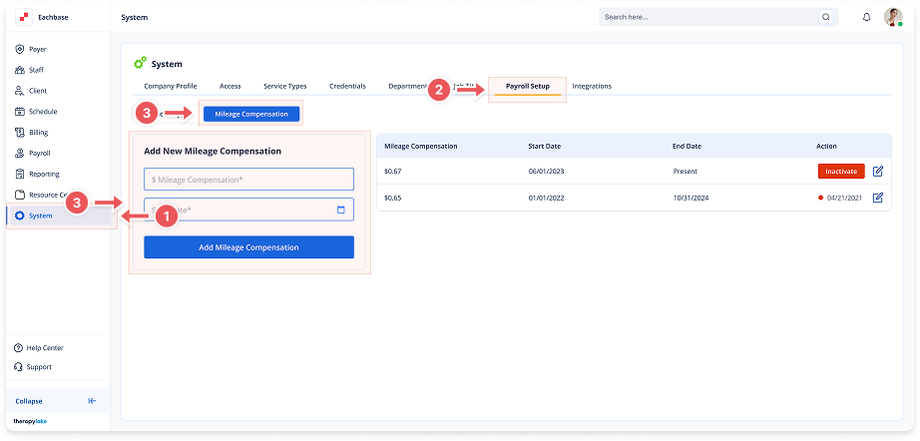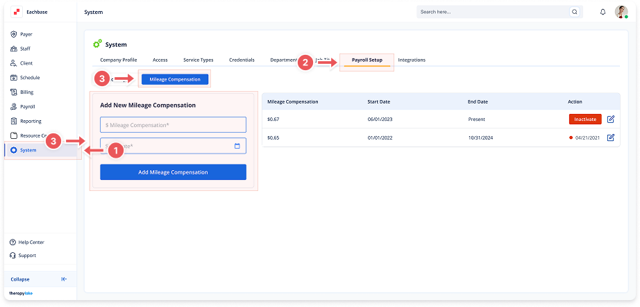 Ensure the Mileage Compensation tab is selected on the left side.