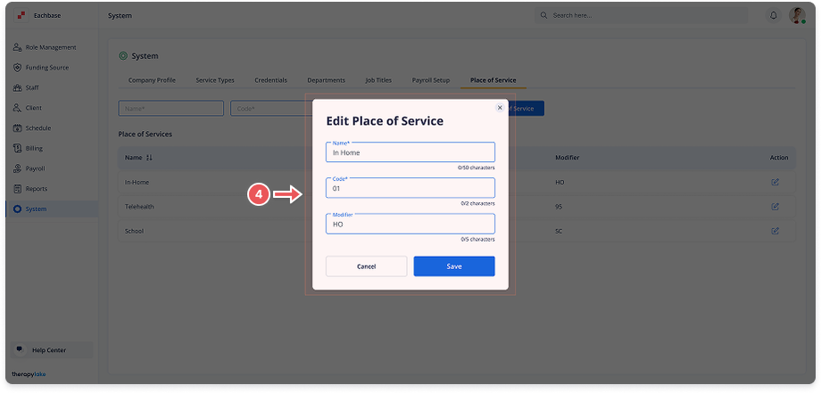 Name: Edit the location name (e.g., "School", "Telehealth", "In Home")